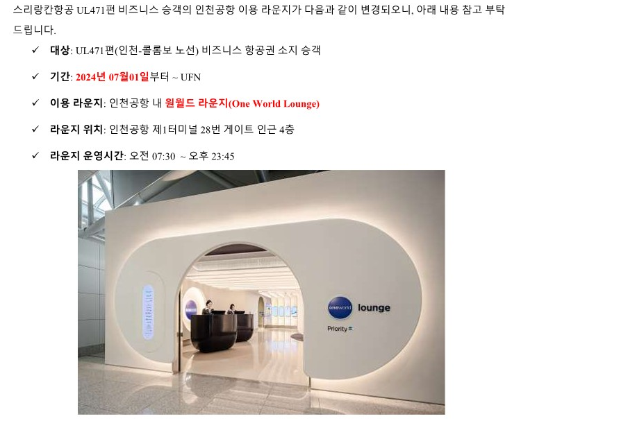 [스리랑칸항공] UL471편 비즈니스 승객 인천공항 이용 라운지 변경 안내
