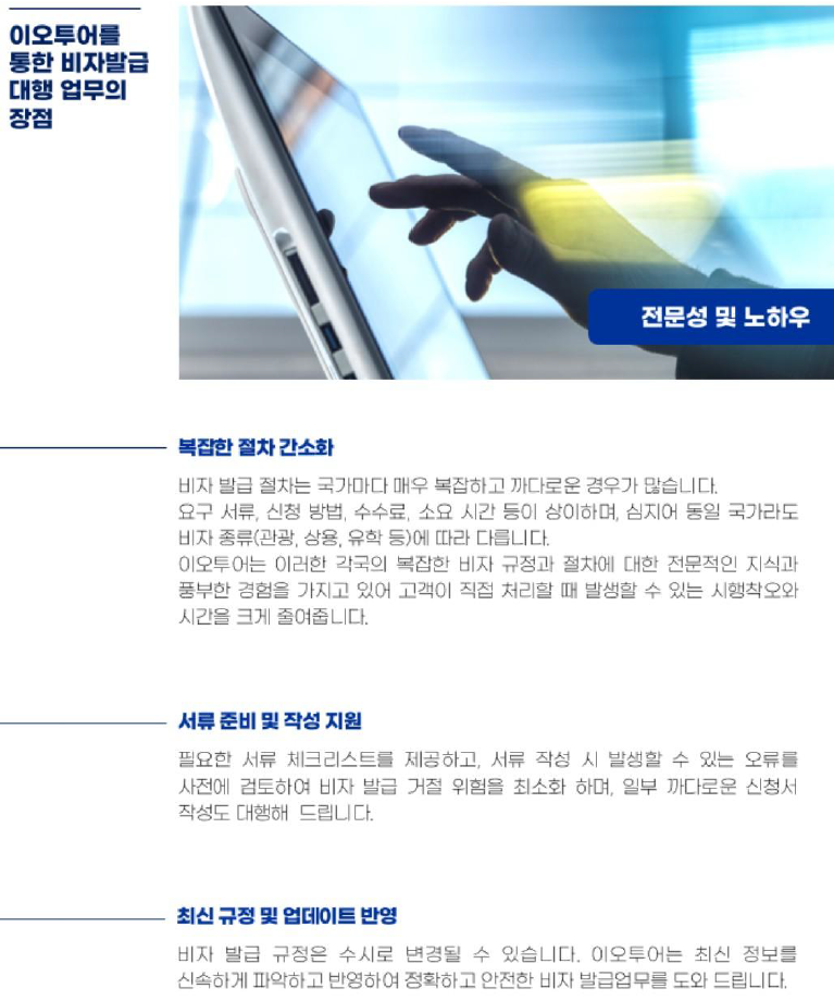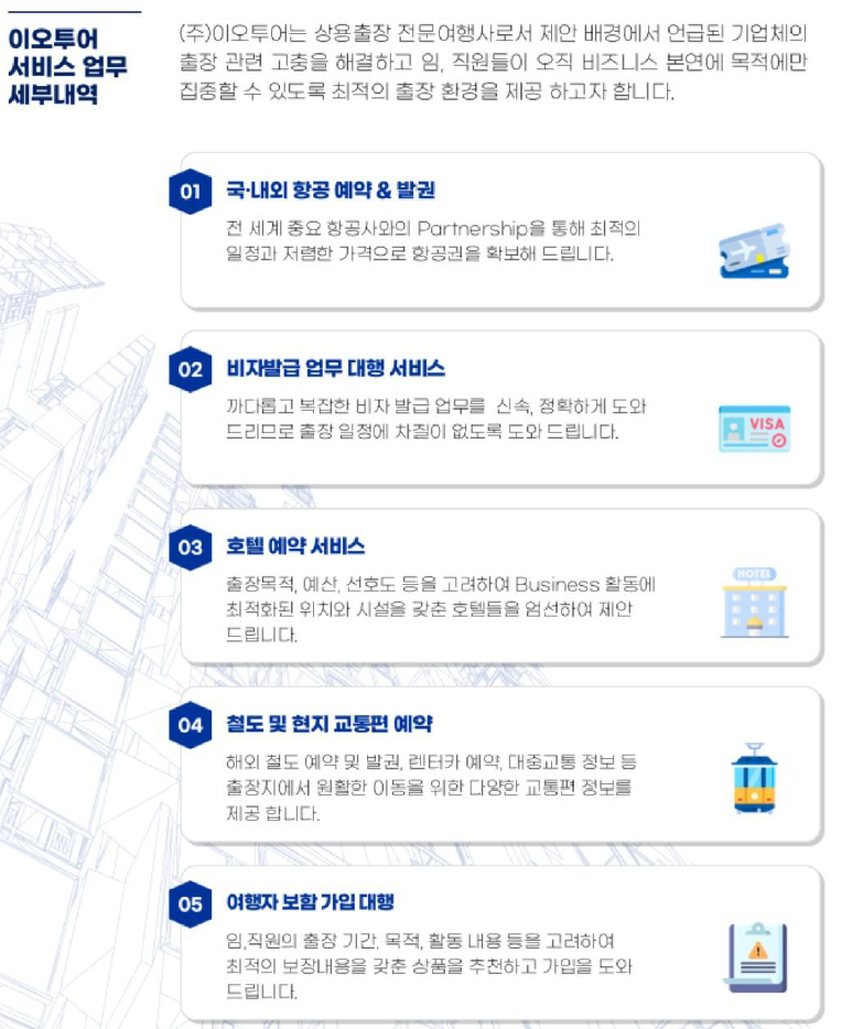 주)이오투어는 귀사의 출장관리 프로그램이 올바른 방향으로 운영될 수 있도록 적극 지원합니다. 고객의 편안하고 안전한 출장을 위해 최신 테크놀로지를 도입하여 체계적이고 효율적으로 관리해드리며 MICE 전문팀만의 노하우로 감동적인 서비스를 제공하고 있습니다.